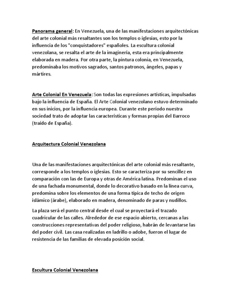 Arte colonial en venezuela y latinoamérica el arte colonial en latinoamérica empieza con la llegada de los españoles y el descubrimiento del nuevo mundo en donde comienza la transculturización, en donde la cultura hispánica es tomada por la nueva cultura que empezaba a desarrollarse en américa... Artes musicales y escénicas de la venezuela colonial... Artes musicales y escénicas de la venezuela colonial.